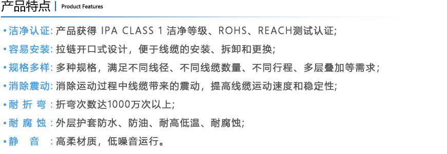 易安裝式優于封閉式拖鏈結構,外層護套采用拉鏈開口式結構,便于線纜的安裝和更換。中間線纜由柔性線卡分隔和固定,提高線纜排布的速度和美觀度,同時減少線纜絕緣層的磨損,延長線纜的使用壽命。支持多層疊加,支持龍骨支撐,滿足長行程應用場景。
